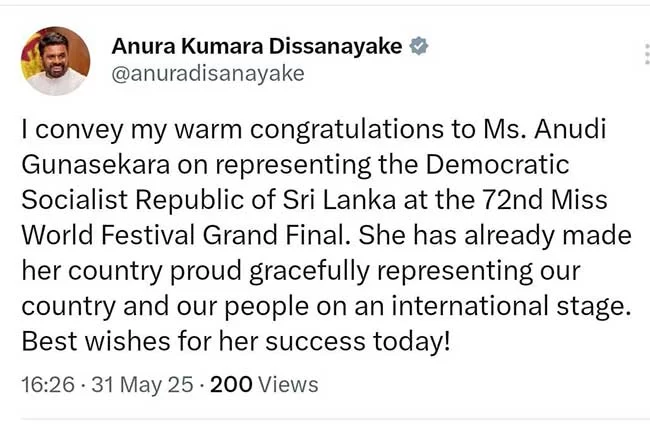 72 වන ලෝක රූ රැජින උළෙලේදී අවසන් මහා තරගයේදී ශ්රී ලංකා නියෝජනය කරන අනුදි ගුණසේකරට ජනාධිපති අනුර කුමාර දිසානායක මහතා විසින් සුබ පැතුම් එක් කර තිබෙනවා.